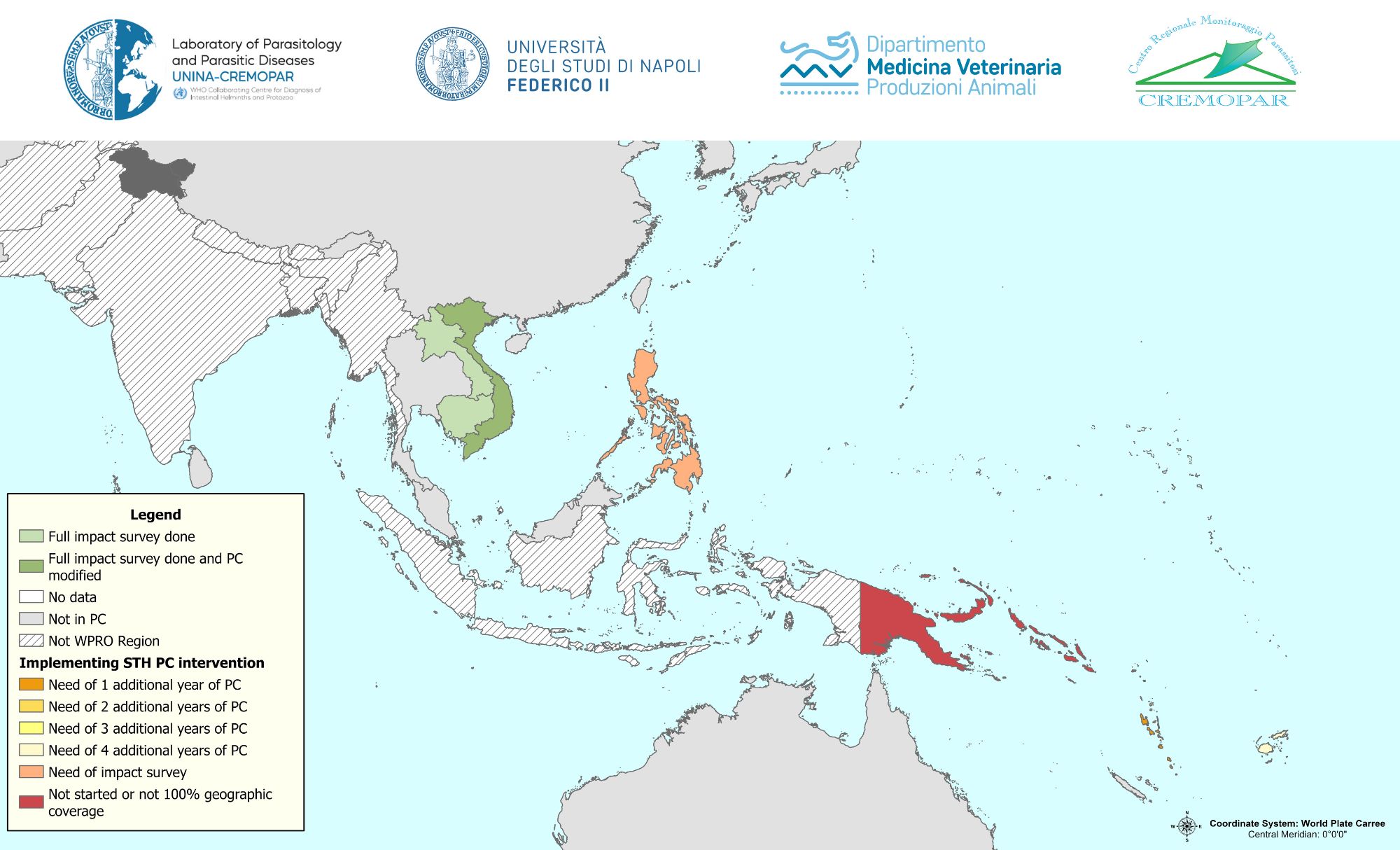 The World Health Organization (WHO) recommends preventive chemotherapy (PC) as the primary intervention to control morbidity of soil-transmitted helminthiasis (STH). In this series of maps we present the progress of the PC coverage in the different countries (different shades of yellow) and the need of conducting impact survey (peach); countries that already conducted impact survey are presented in green (https://youtu.be/P2RZE5UoSU0).